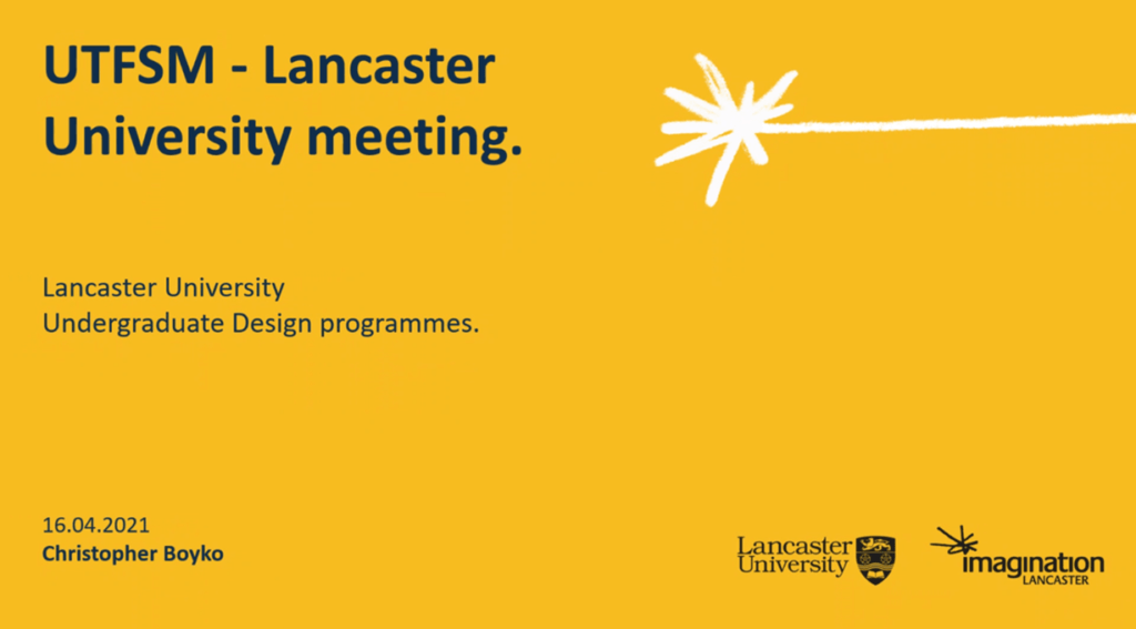 David Pérez, ex alumno de la carrera y actual docente de ImaginationLancaster en conjunto con Leonardo Madariaga, académico de la carrera, se plantearon la posibilidad de una colaboración entre el Departamento de Ingeniería en Diseño de la Universidad Técnica Federico Santa María y el Departamento de Diseño de la Universidad de Lancaster.