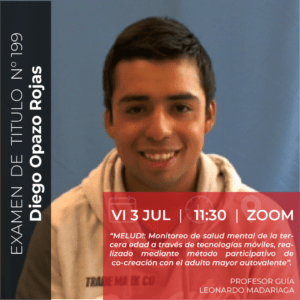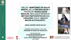 Y por último nuestro Ingeniero en Diseño de Productos n°199, Diego Opazo presentando el tema “MELUD!: MONITOREO DE SALUD MENTAL DEL ADULTO MAYOR A TRAVÉS DE TECNOLOGÍAS MÓVILES, REALIZADO MEDIANTE MÉTODO PARTICIPATIVO DE CO-CREACIÓN CON EL ADULTO MAYOR AUTOVALENTE” y en la comisión Leonardo Madariaga (profesor Guía) y Juan Carlos Briede.