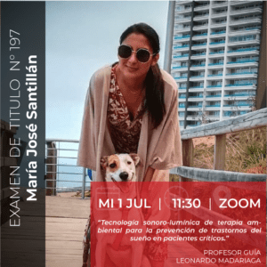 El miércoles fue nuestra primera titulada de la semana y quien inauguró esta etapa de memorias online siendo la n°197, María José Santillán presenta el tema “SKYROOM: TECNOLOGÍA SONORO-LUMÍNICA DE TERAPIA AMBIENTAL PARA LA PREVENCIÓN DE TRASTORNOS DEL SUEÑO EN PACIENTES CRÍTICOS.”Teniendo en la comisión a Leonardo Madariaga (Profesor Guía) y Vicente Arenas.