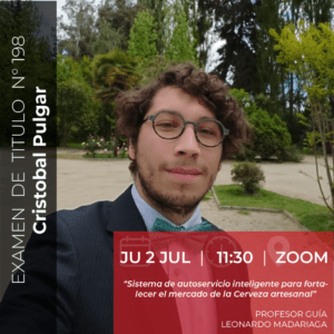 Para el jueves 2 de julio se presentó Cristobal Pulgar titulado n°198 con su tema de título “SISTEMA DE AUTOSERVICIO INTELIGENTE PARA FORTALECER EL MERCADO DE LA CERVEZA ARTESANAL.” teniendo en la comisión a Leonardo Madariaga (Profesor Guía) y Gabriela López.