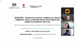 presenta el tema “SKYROOM: TECNOLOGÍA SONORO-LUMÍNICA DE TERAPIA AMBIENTAL PARA LA PREVENCIÓN DE TRASTORNOS DEL SUEÑO EN PACIENTES CRÍTICOS.” Teniendo en la comisión a Leonardo Madariaga (Profesor Guía) y Vicente Arenas.